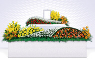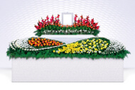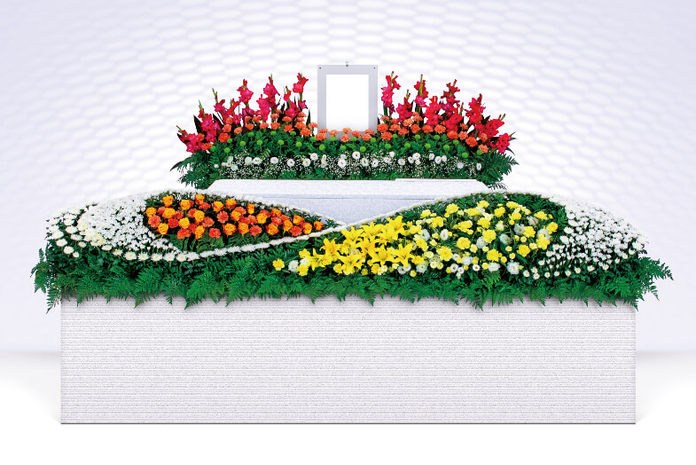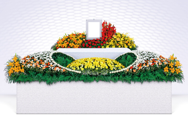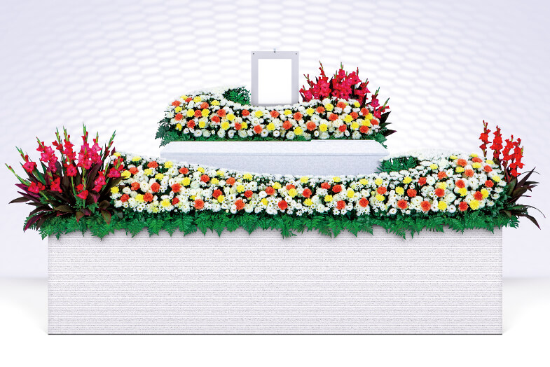 菊、小菊、バラ、カーネーション、グラジオラス、スカシユリ、オンシジウム、ソリダコ、ユリ、ガーベラ、スプレーマム、スプレーカーネーション、スプレーバラ、レモンリーフ、カスミ草、レザーファン、ロベ