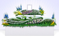 白菊、小菊、スプレーマム、カーネーション、デルフィニウム、トルコキョウ、カサブランカ、利休草、カスミ草、レザーファン