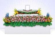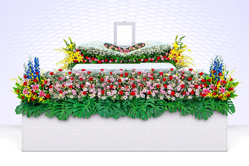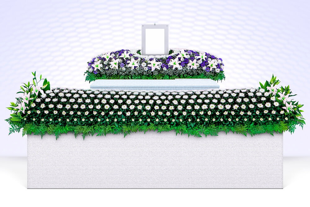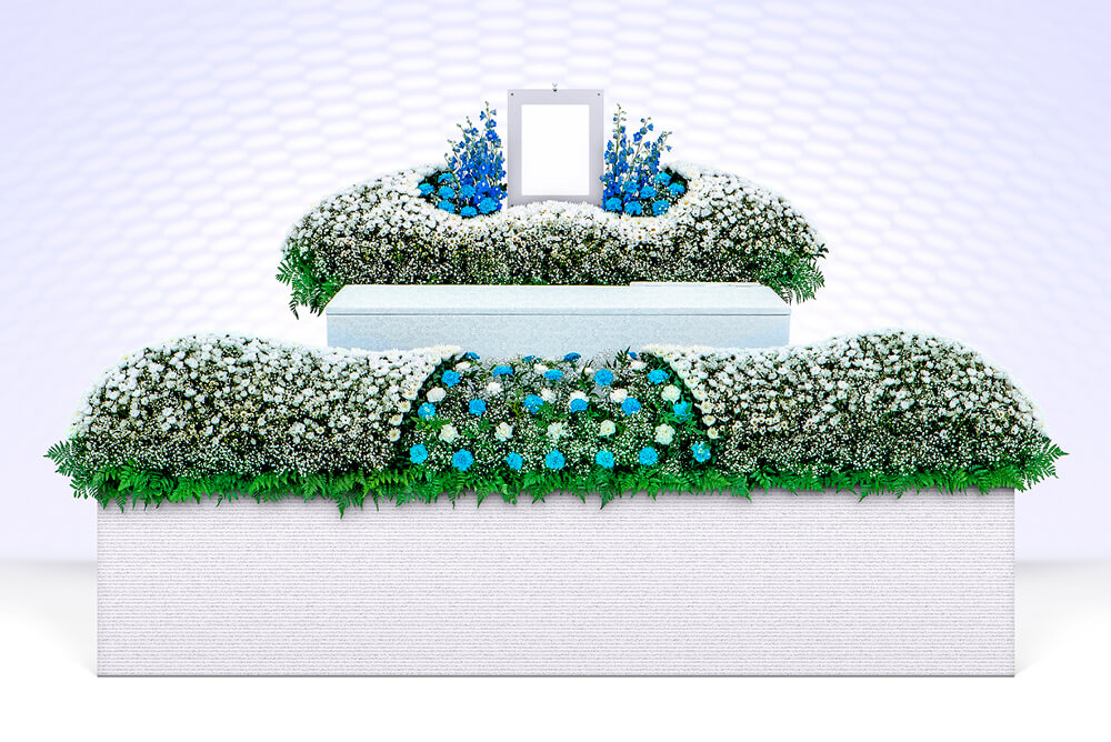 白菊、小菊、スプレーマム、カーネーション、ソケイ、デルフィニウム、カスミ草、レザーファン